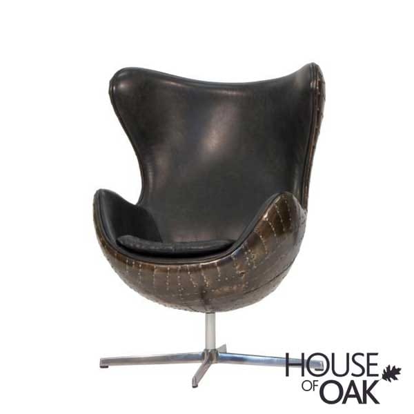 The Keeler chair is part of our iconic Aviator range which blends design inspired by military aircraft, echoing the Spitfires riveted structure of joining aluminium panels. This chair has a jet brass finish with 4 base wheels and a comfortable black leather seat.