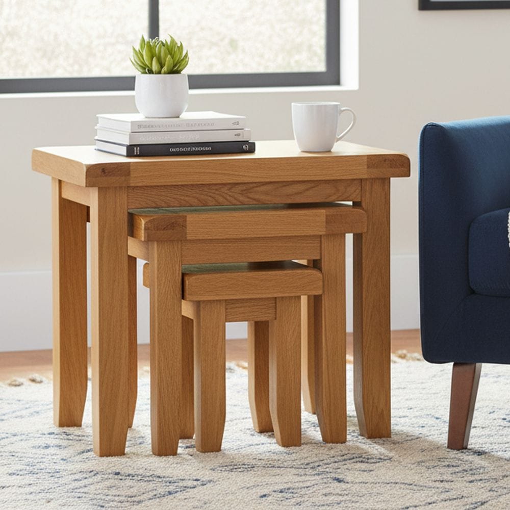 The Canterbury Oak Nest of Tables offers versatile living room practicality with a warm and timeless oak finish. Each table slides neatly beneath the next, providing three useful surfaces that can be used together when guests arrive or separated throughout the room for drinks, lamps or décor.