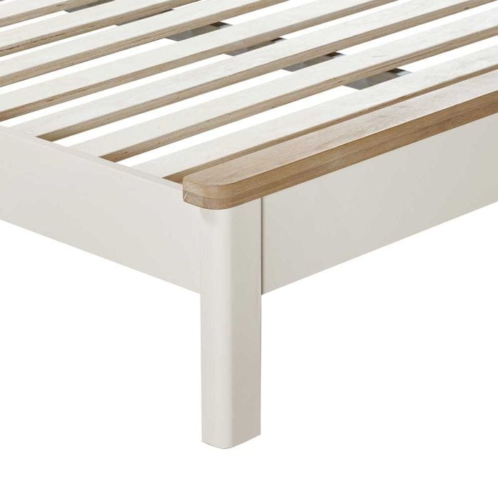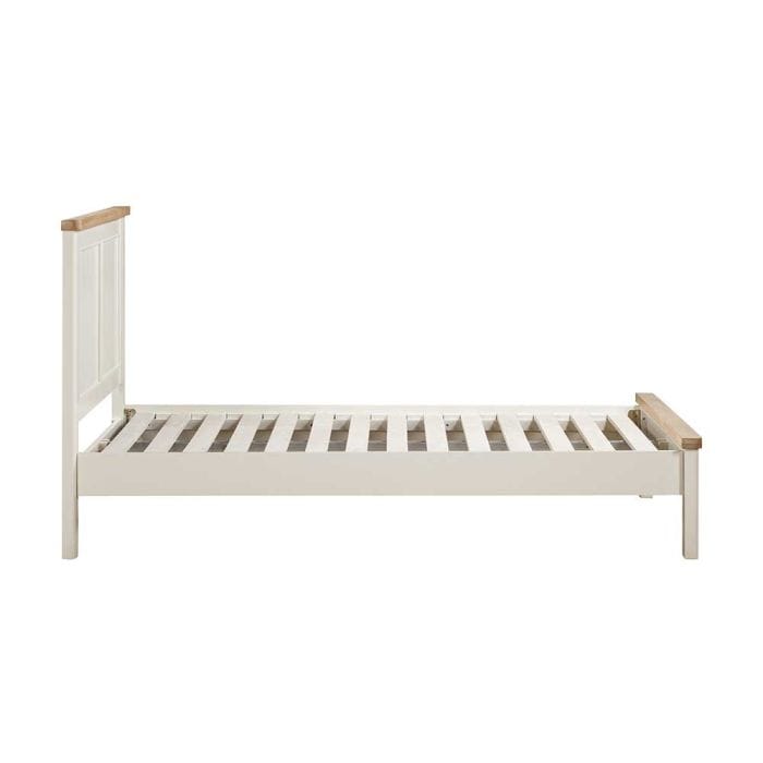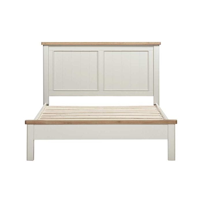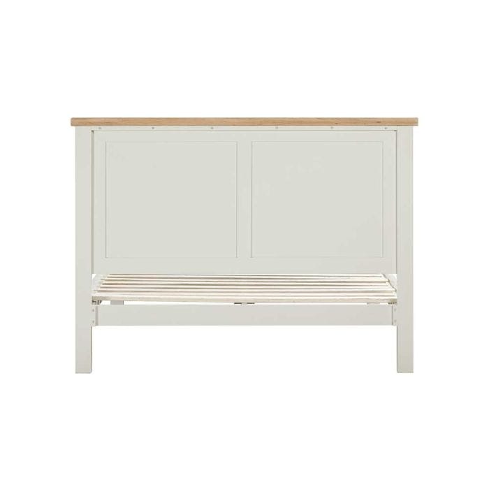 The Carrington Oak 4FT 6” Double Panelled Bed brings timeless elegance and sturdy craftsmanship to your bedroom. Constructed from solid pine and finished with a solid oak top, this bed offers exceptional durability and a refined appearance. The off-white painted frame contrasts beautifully with the natural oak top, adding warmth and a rustic touch to your sleeping space.