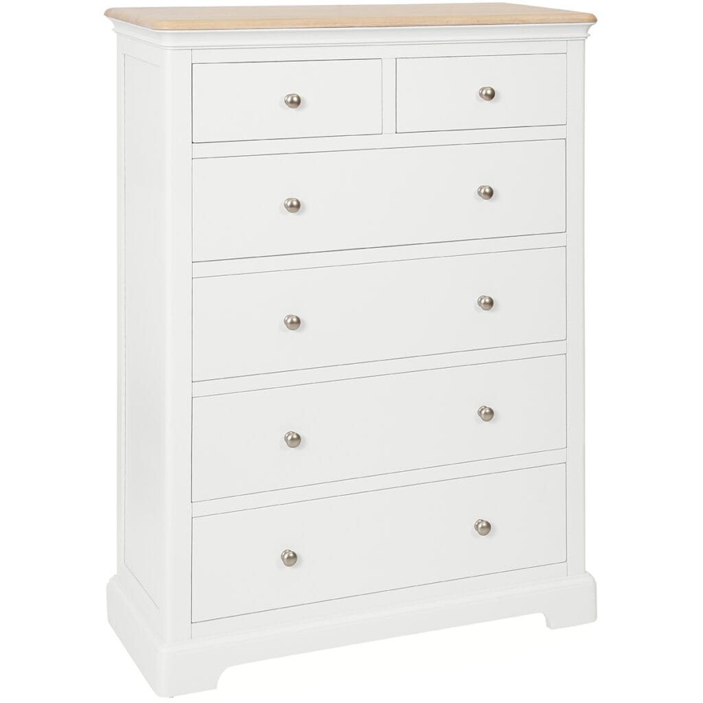 The Cornwall White Painted 2 Over 4 Chest brings a calm and welcoming feel to the bedroom. It offers two smaller drawers at the top for accessories and everyday items, with four larger drawers beneath for folded clothes and bulkier pieces. The shape is tall and elegant, and the top surface is well sized for a lamp, framed photographs, books or a mirror.