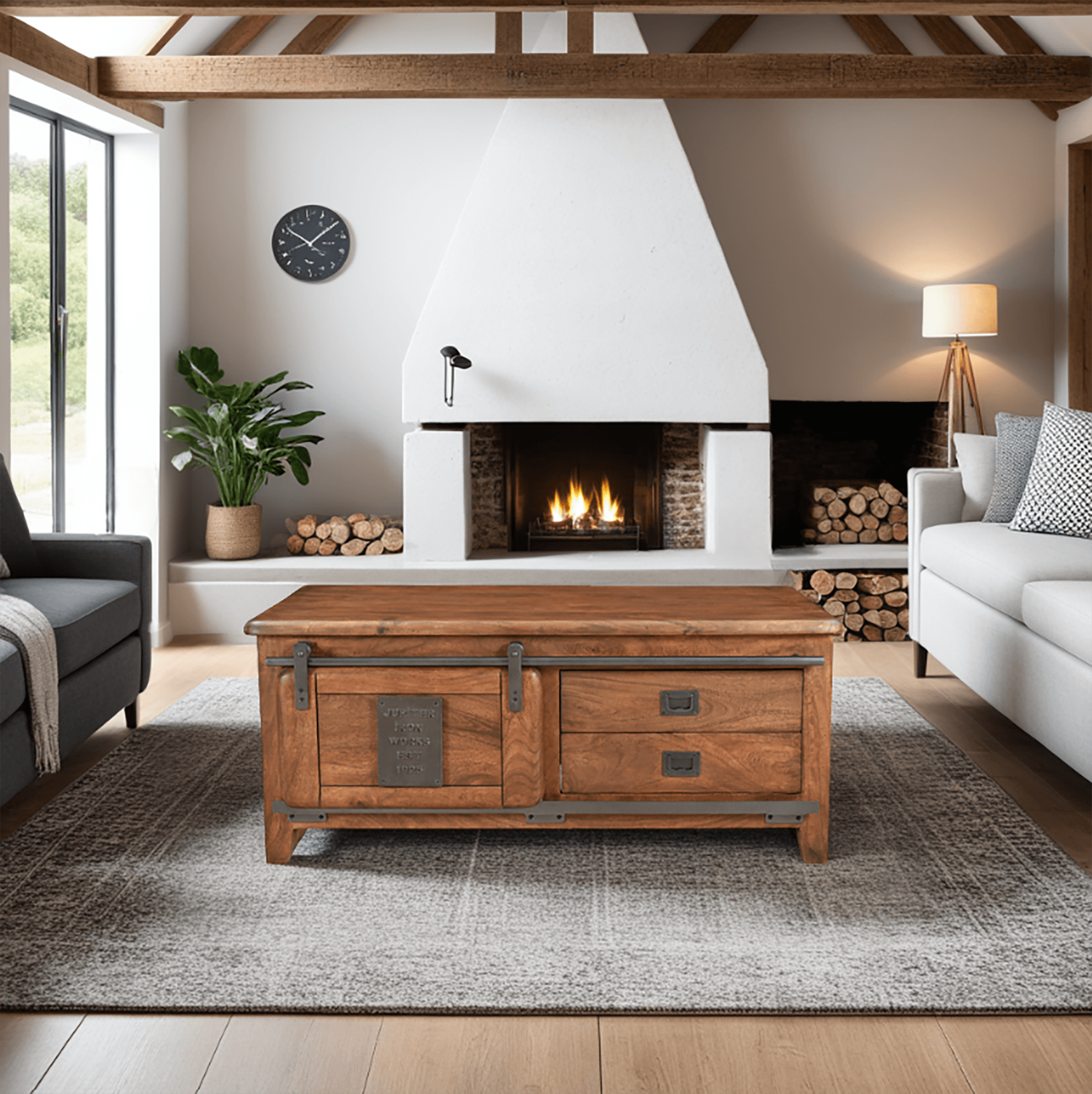 Add a bold statement to your living room with the Fusion Soft Industrial Coffee Table. Expertly crafted from solid mango wood and iron, this handcrafted piece features unique sliding doors and deep drawers—perfect for keeping your space stylishly clutter-free.