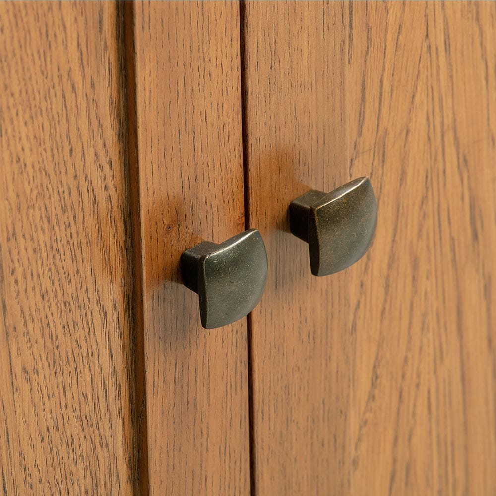 Crafted from solid North American White Oak and finished in a medium rustic lacquer, it highlights the natural grain and warmth of the wood while protecting the surface for everyday use. Inside, a central divider and adjustable shelves make it easy to customise the storage layout for dinnerware, linens, board games, or other household essentials.