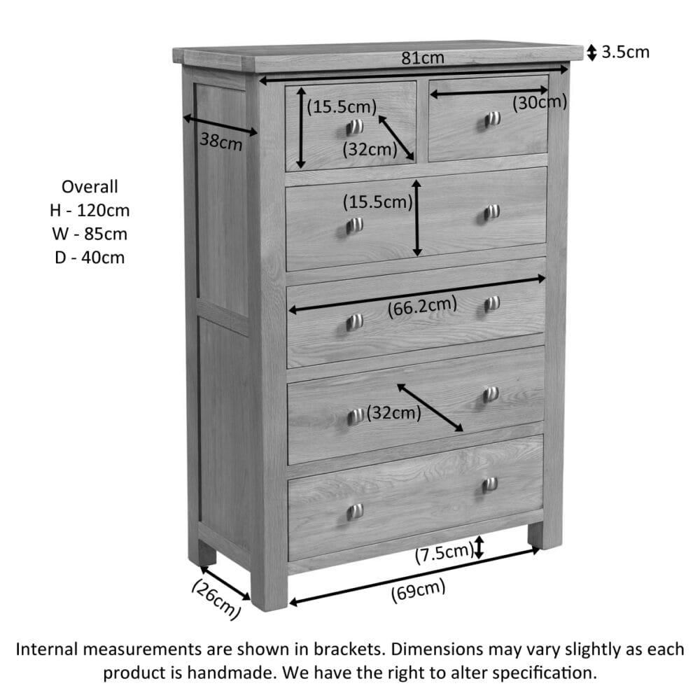 Make the most of your bedroom space with the Keswick Rustic Oak 2 Over 4 Chest of Drawers. Designed to offer generous storage in a compact footprint, this tall chest features two smaller top drawers and four full-sized lower drawers—perfect for keeping clothing, accessories, and everyday essentials neatly organised.