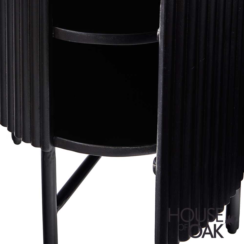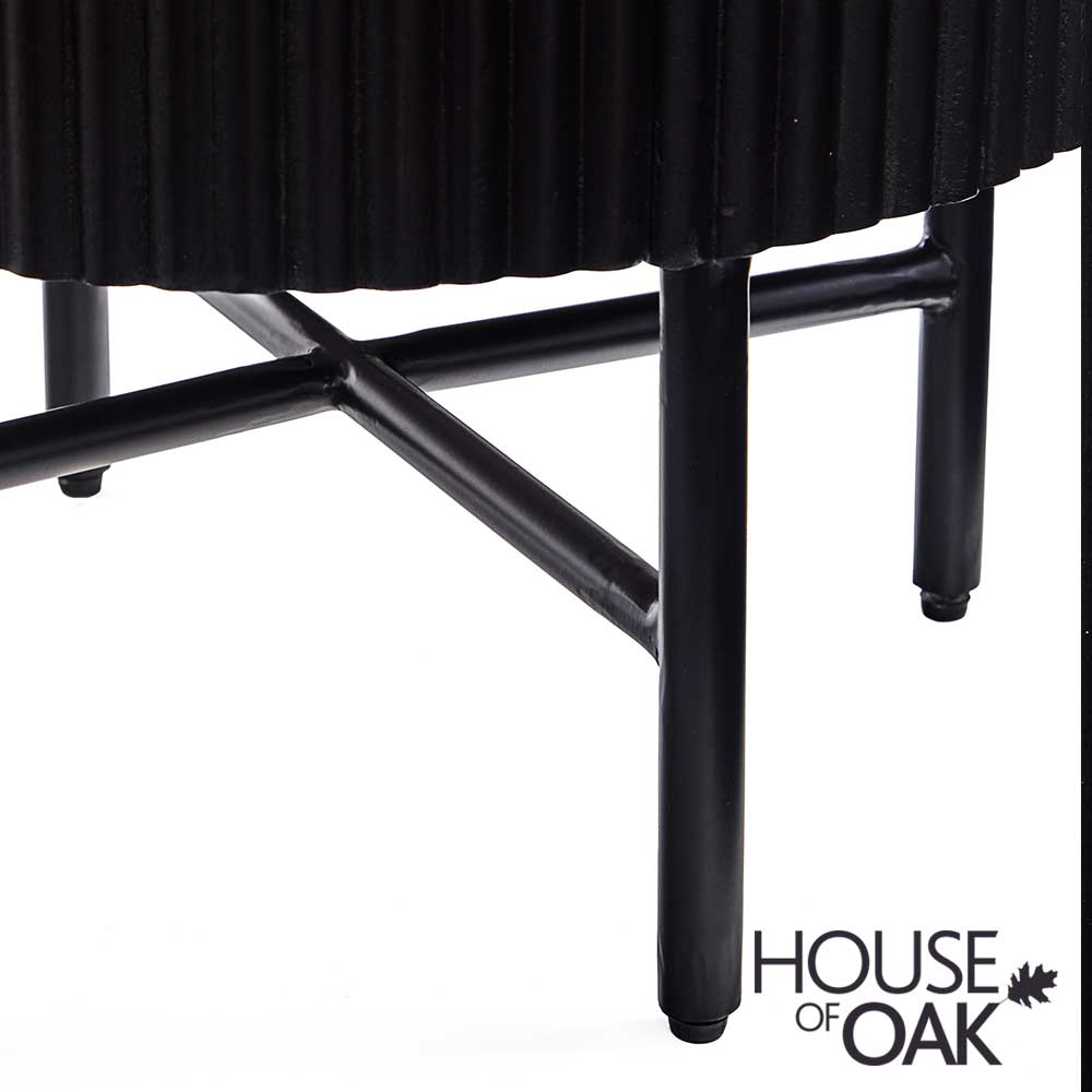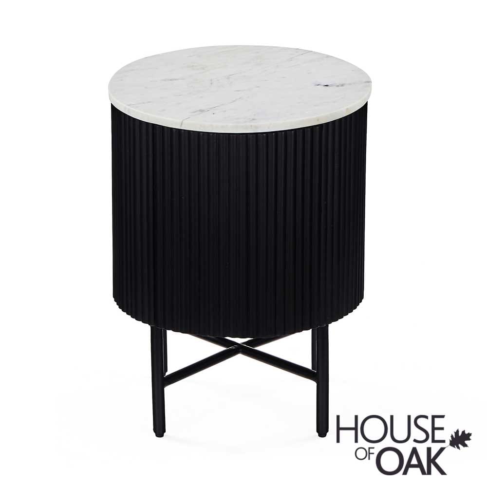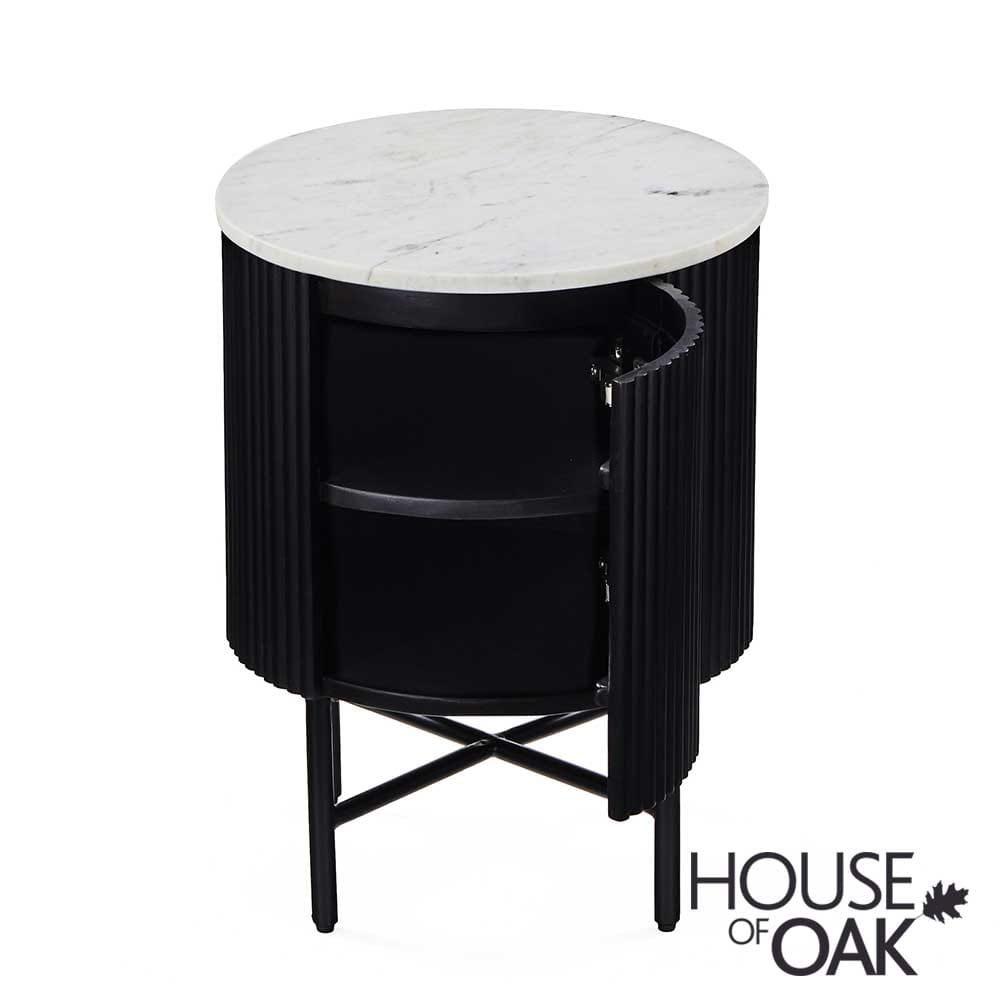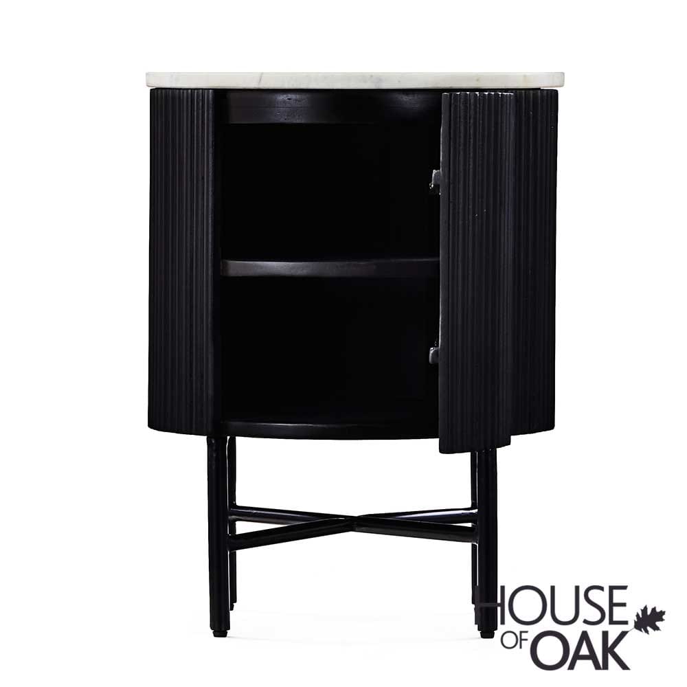 The Monaco in Charcoal Furniture Range accentuates its racetrack curves with dynamic ribbing. Multiple finishes provide harmonious contrast, tinting the solid mango charcoal and leaving the marble top a natural hue. A black-finished base elevates the range with round legs to complement the rounded silhouette. A push on the seamlessly integrated door opens to inner storage to shelves in most items. The contrasting solid real marble top makes the range eye catching, hygienic & incorporates a modern twist to any interior.