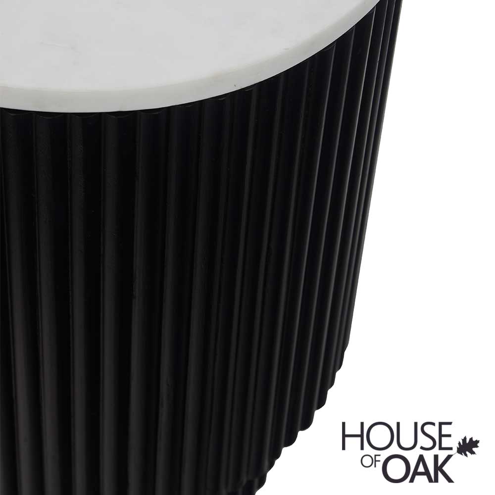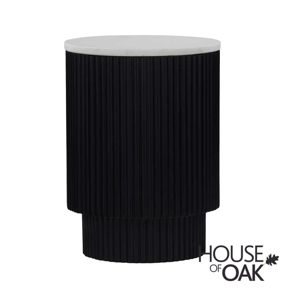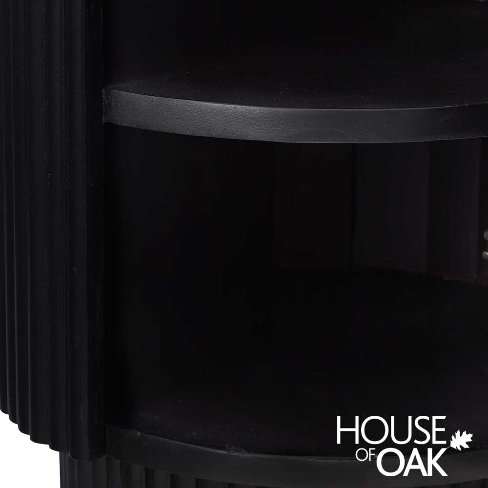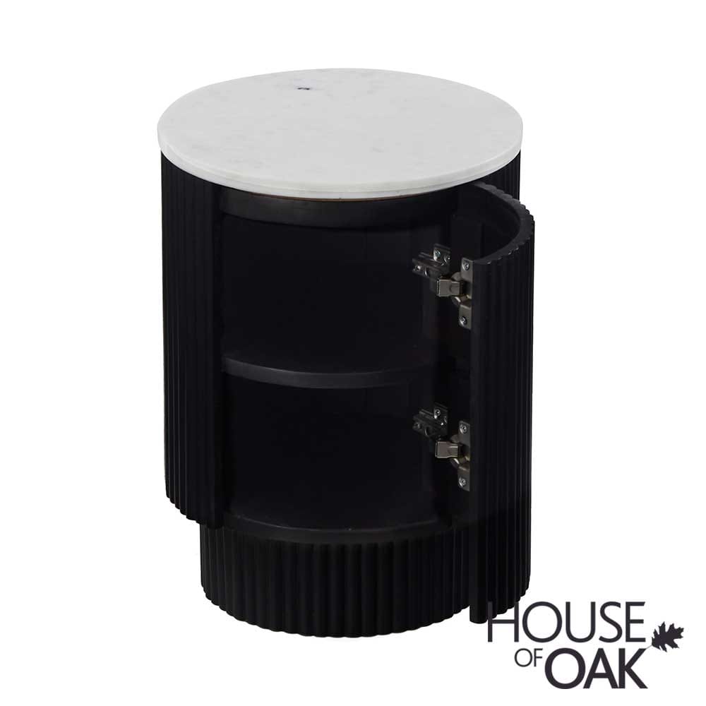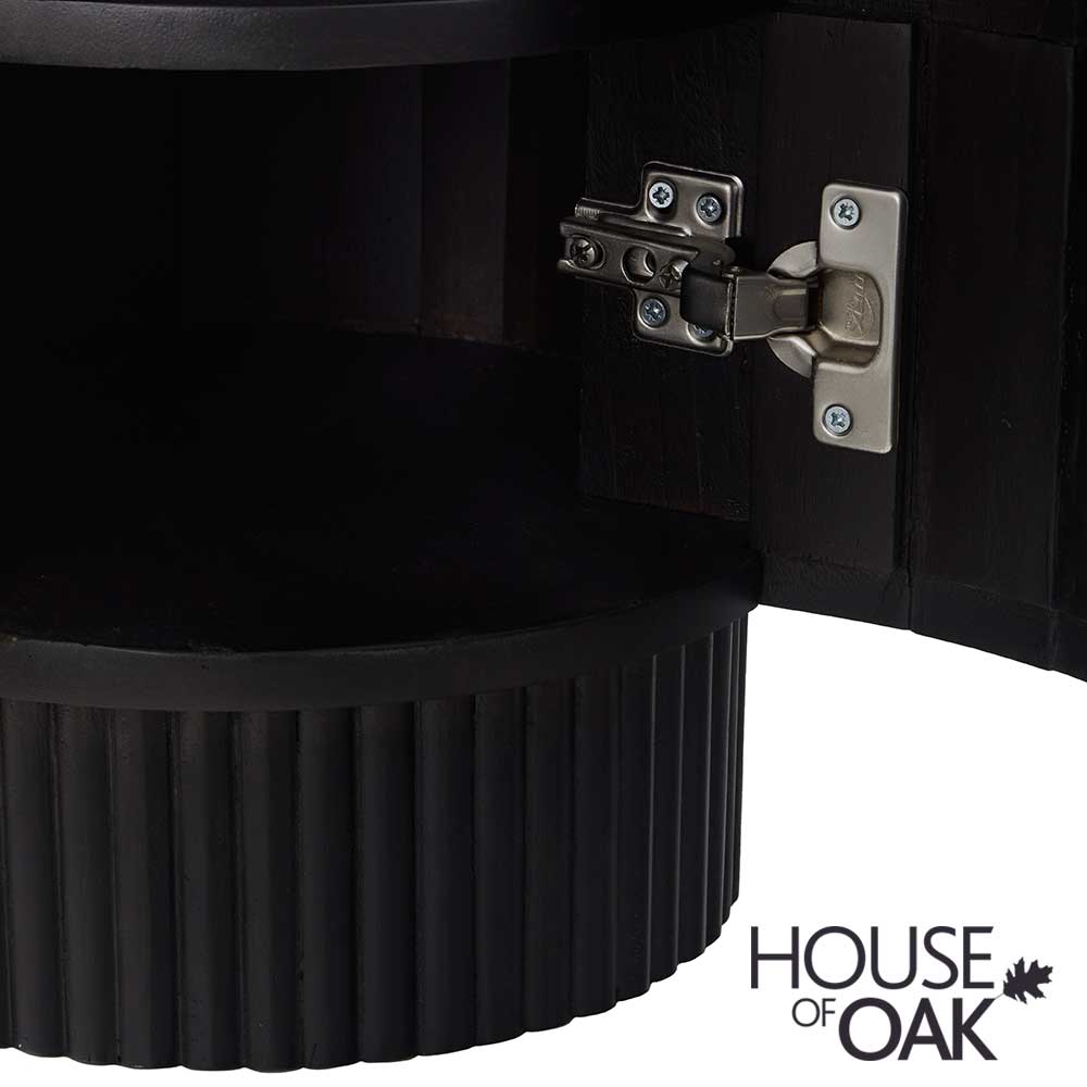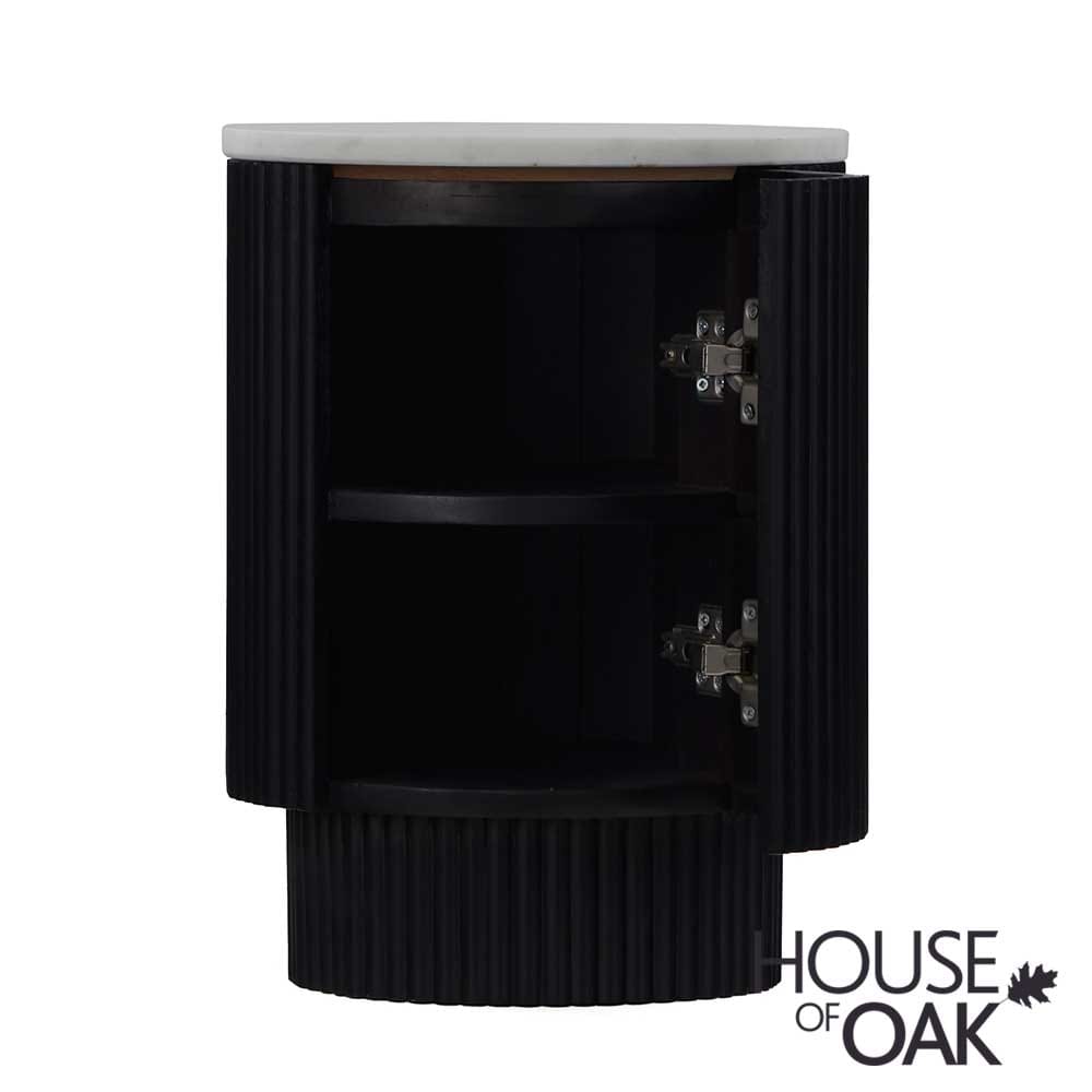 The Monaco in Charcoal Furniture Range accentuates its racetrack curves with dynamic ribbing. Multiple finishes provide harmonious contrast, tinting the solid mango charcoal and leaving the marble top a natural hue. A black-finished base elevates the range with round legs to complement the rounded silhouette. A push on the seamlessly integrated door opens to inner storage. The contrasting solid real marble top makes the range eye catching, hygienic & incorporates a modern twist to any interior.