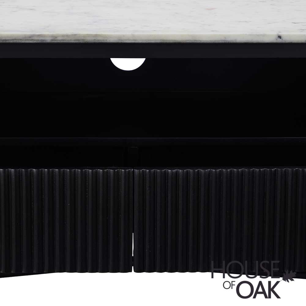The Monaco in Charcoal Furniture Range accentuates its racetrack curves with dynamic ribbing. Multiple finishes provide harmonious contrast, tinting the solid mango charcoal and leaving the marble top a natural hue. A black-finished base elevates the range with round legs to complement the rounded silhouette. The contrasting solid real marble top makes the range eye catching, hygienic & incorporates a modern twist to any interior.