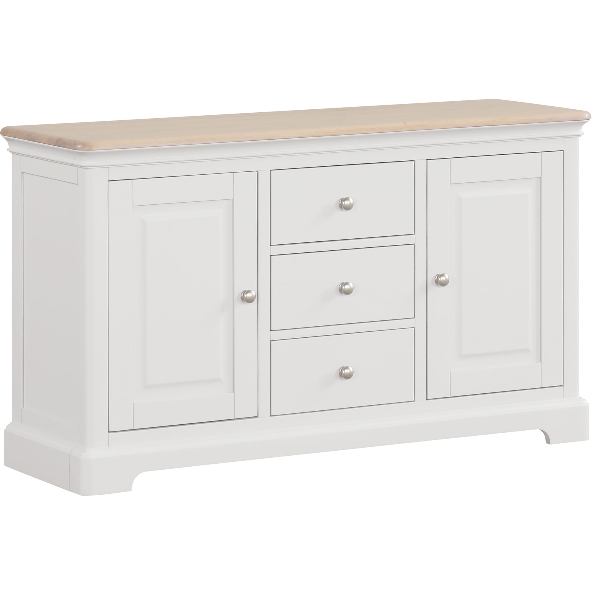 The Cornwall Painted Oak 2 Door 3 Drawer Sideboard offers generous storage for dining rooms, kitchens and living spaces. The Grey Mist painted frame keeps the look soft and modern, while the solid oak top adds warmth and natural texture. Curved edges and a shaped plinth introduce gentle traditional detailing without feeling overly decorative.