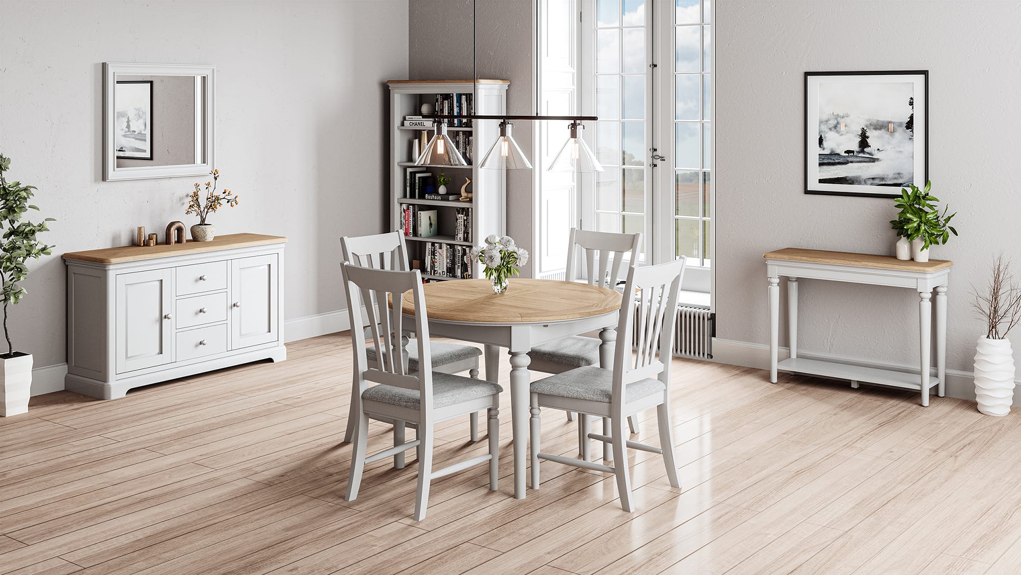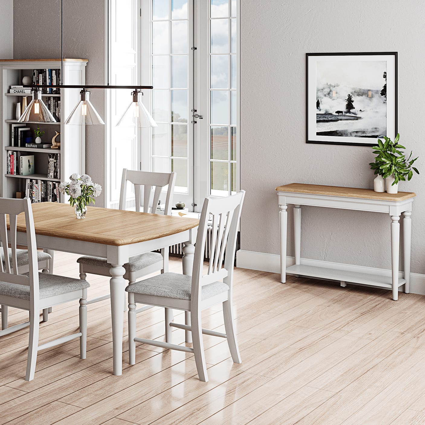 The Cornwall Painted Oak Console Table is designed for hallways, entrances and living spaces where a slim storage surface is needed. The Grey Mist painted frame gives a light, uncluttered feel, while the solid oak top brings warmth and natural grain. Turned legs and a shaped plinth add soft traditional character without making the piece overly decorative.