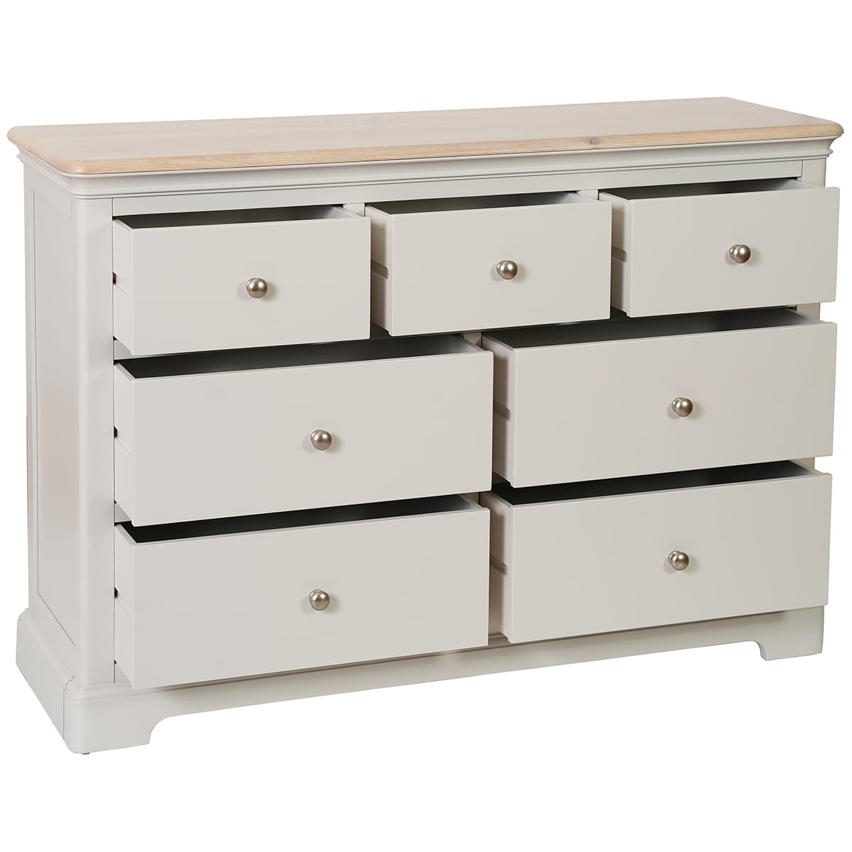The large surface area is ideal for displaying a mirror, lamp, TV, or decorative items, making this chest as functional as it is stylish. Finished in a soft Grey Mist paint with lightly lacquered solid oak tops, it features gentle curves, rounded edges, and moulded cornices that echo the feminine charm of the full Cornwall collection.