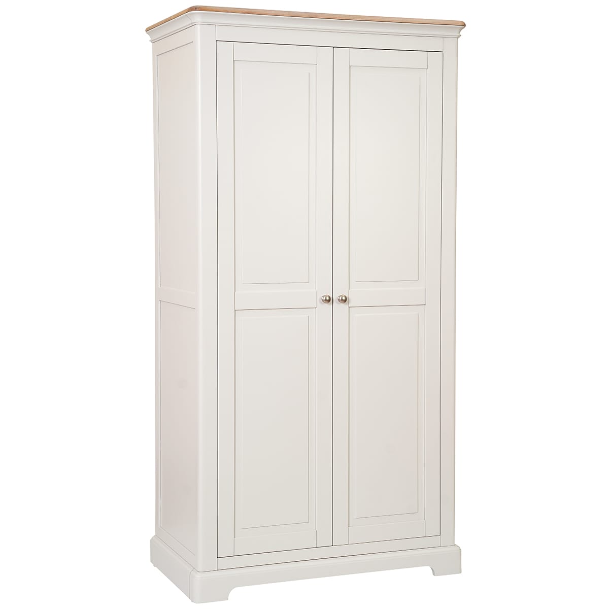 The Cornwall Grey Mist All Hanging Double Wardrobe offers a simple and elegant full-height storage solution. The Grey Mist painted finish keeps the look calm and soft, while lightly lacquered oak tops add warmth and natural character. Gentle curves and rounded detail reflect the classic Cornwall design style.