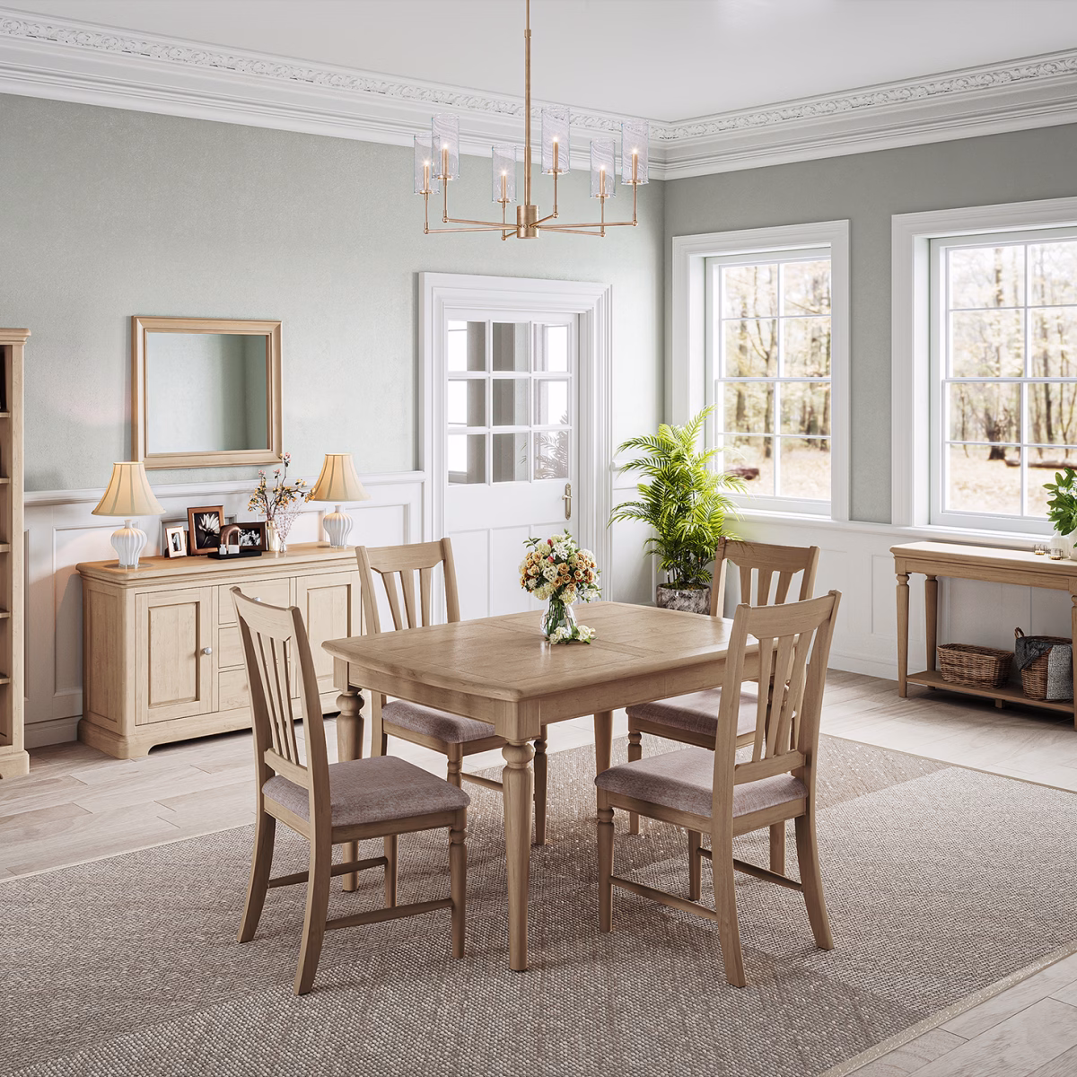 Crafted from White Oak, pine and MDF, the table features classic turned legs, a beautifully finished solid oak top and two hidden extension leaves stored neatly inside the frame. Smooth operation and balanced proportions make it a practical and elegant centrepiece for everyday dining or relaxed entertaining.