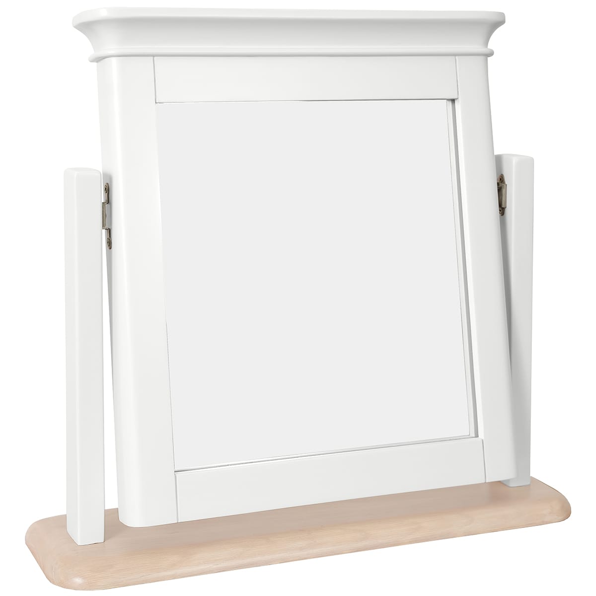 The Cornwall White Painted Dressing Table Mirror is designed to sit neatly on a matching dressing table or chest. It features a rounded solid oak base with side supports that allow the mirror to tilt smoothly, making it easy to adjust the angle while getting ready. The shape is simple and refined, which helps it blend naturally into both modern and traditional bedroom spaces.