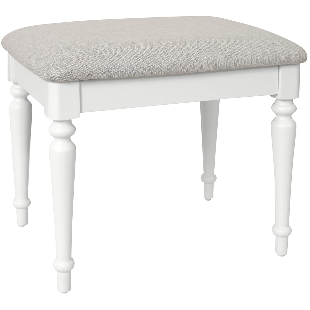 The Cornwall White Painted Dressing Table Stool is a simple and comfortable bedroom seating option, designed to pair beautifully with the Cornwall dressing table. The padded seat is upholstered in a soft light grey fabric that blends easily with both warm and cool interiors, while the turned legs add gentle character and traditional detailing.