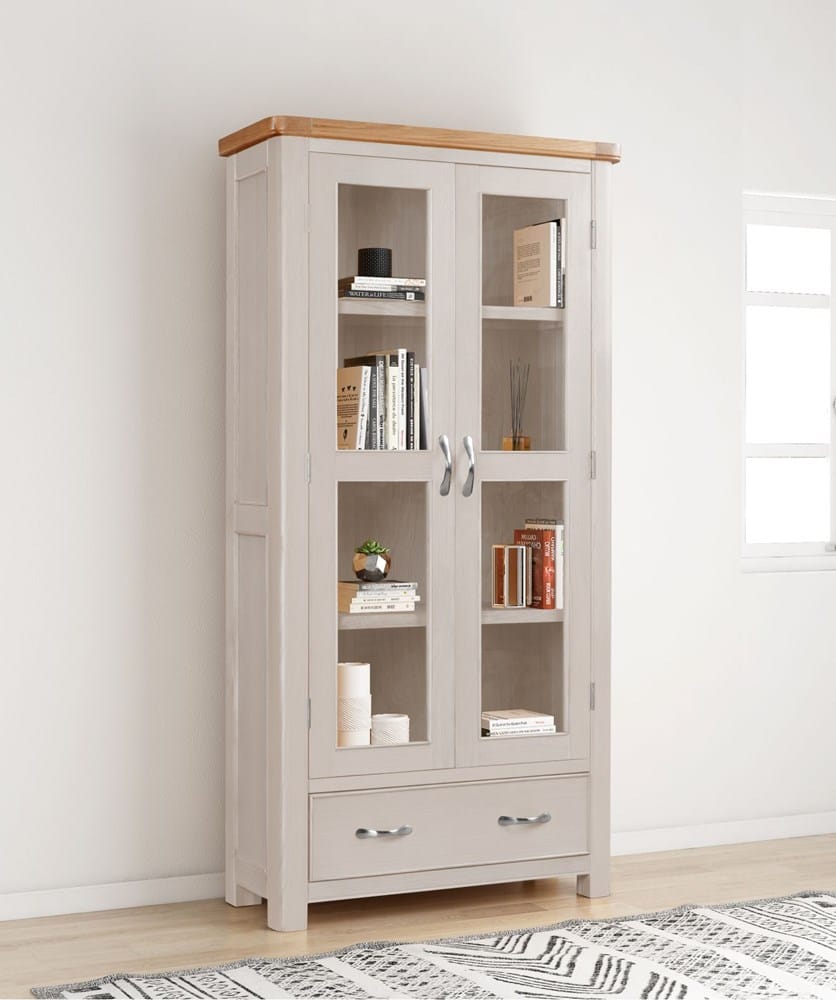 The Kensington Oak Putty Display Cabinet is designed to showcase decorative items while providing practical enclosed storage. Featuring glazed doors, four internal shelves and a generous drawer at the base, this cabinet offers a balanced combination of display space and everyday functionality.