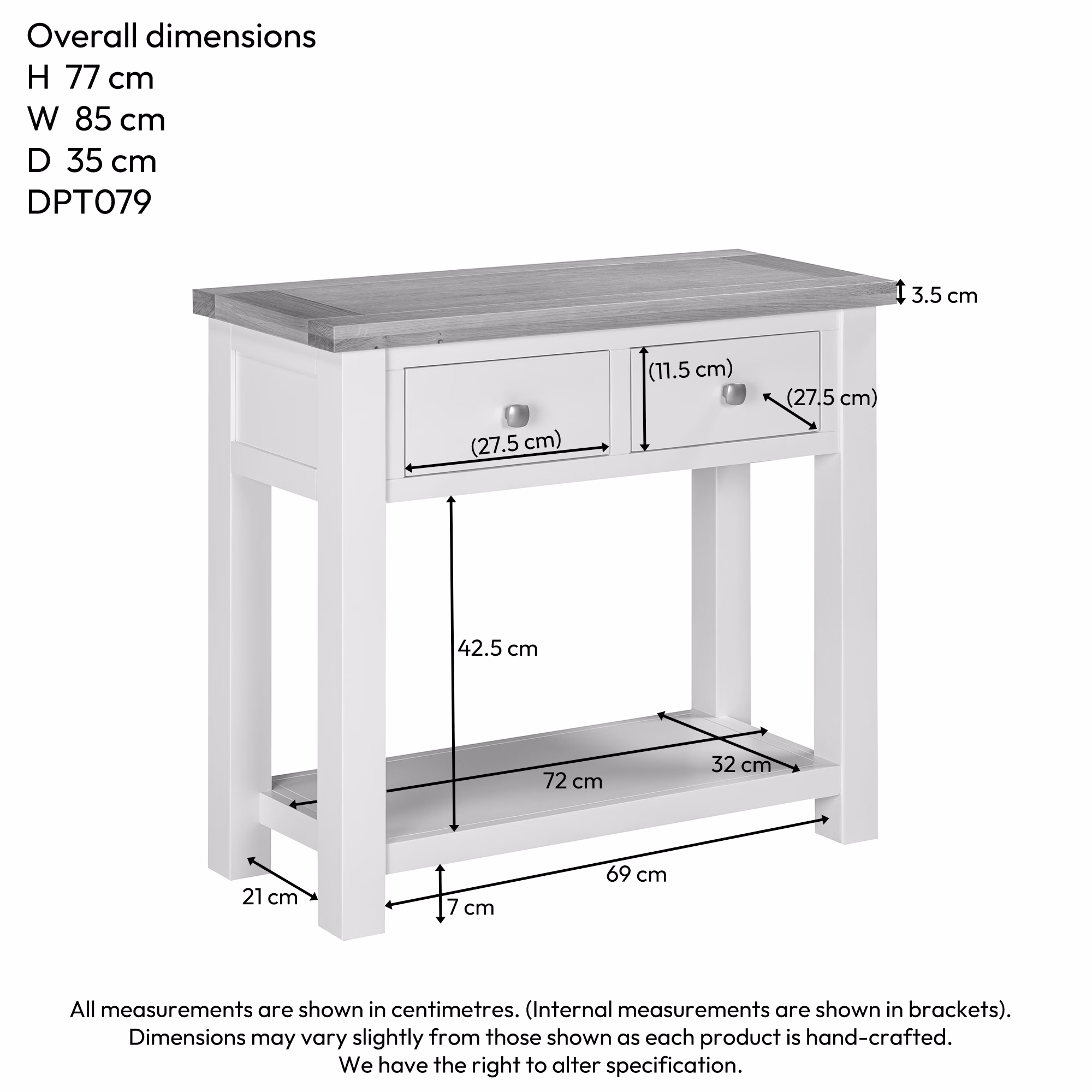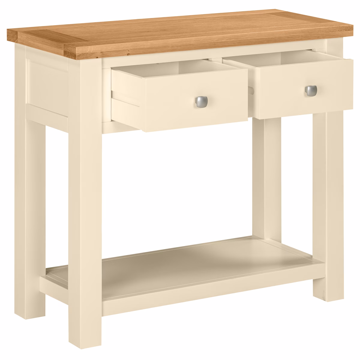 With its elegant silhouette and clean Ivory painted finish, the Keswick Ivory 2 Drawer Console Table brings refined practicality to hallways, living rooms and dining spaces. Balanced proportions, smooth straight lines and a contrasting oak top create a light and timeless look that suits both modern and traditional interiors.
