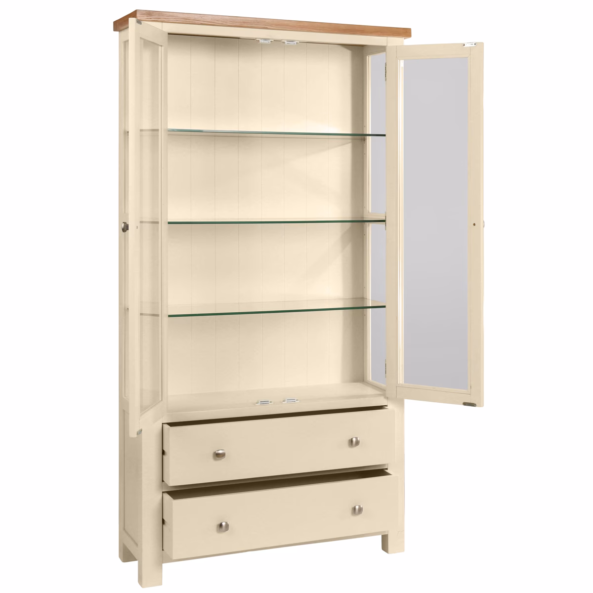 Designed to showcase your favourite pieces in style, the Keswick Ivory Glazed Display Cabinet combines elegant presentation with practical storage. Glass sides and glazed doors allow light to flow through the cabinet, making it ideal for displaying glassware, decorative items or cherished collections, while the Ivory painted finish keeps the look light and refined.