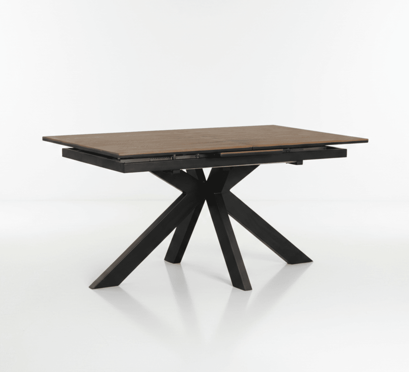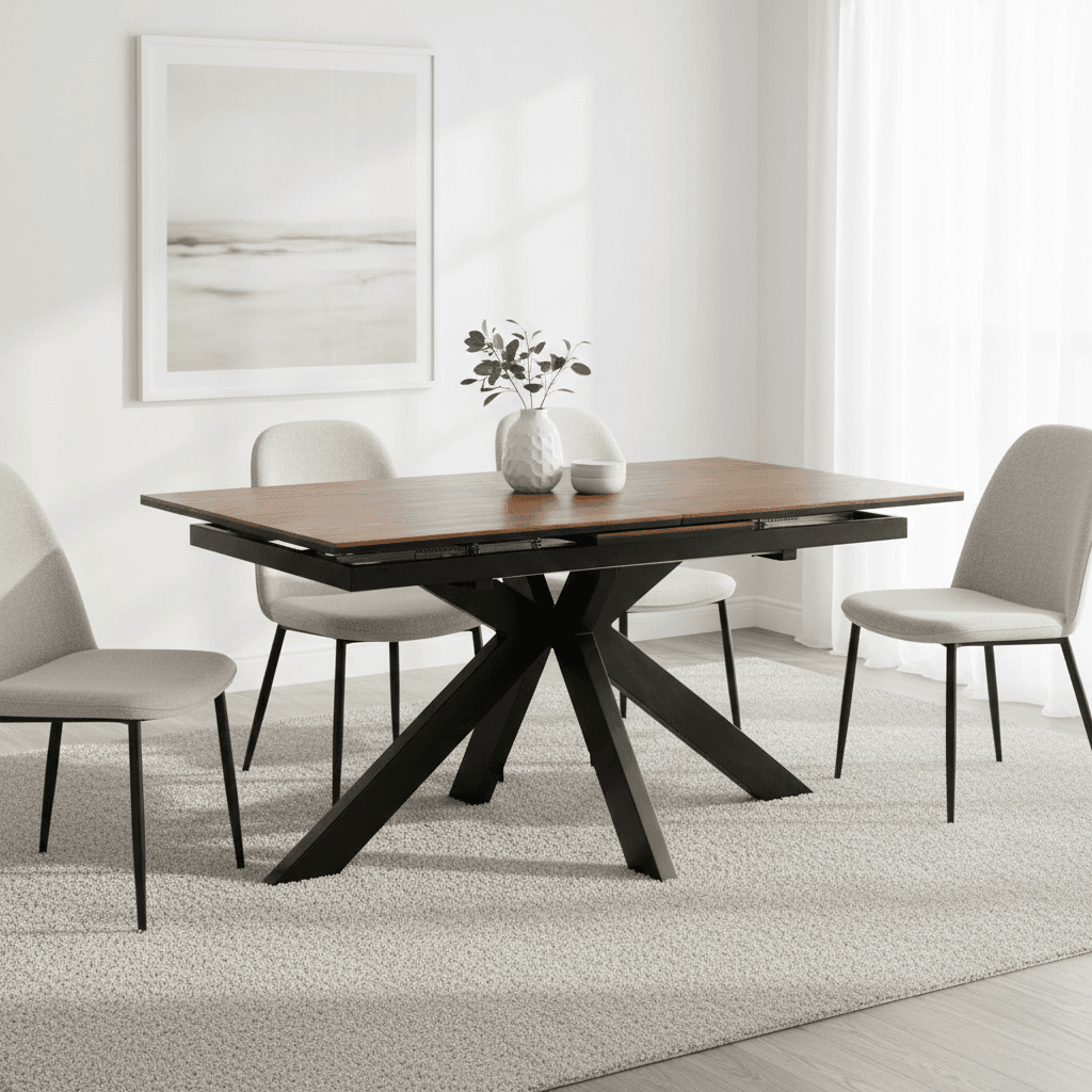 The solid oak top showcases rich grain patterns and a warm, smooth finish, while the striking black metal star base provides stability and adds a modern industrial edge. When you don’t need the extra room, the table sits compactly without compromising on style.