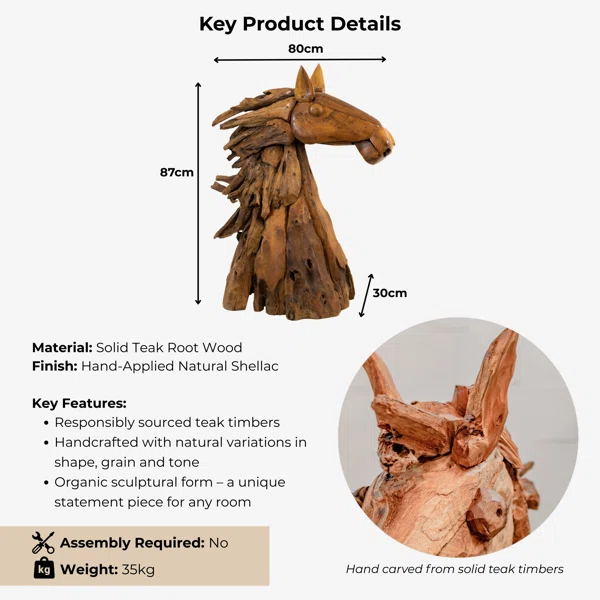 Made from durable materials suitable for outdoor display, this striking woodland horse head décor will naturally weather to a beautiful silver-grey colour over time, just like authentic teak. Perfect for equestrian enthusiasts or lovers of woodland-inspired design, it adds a timeless, rustic charm to your outdoor spaces.