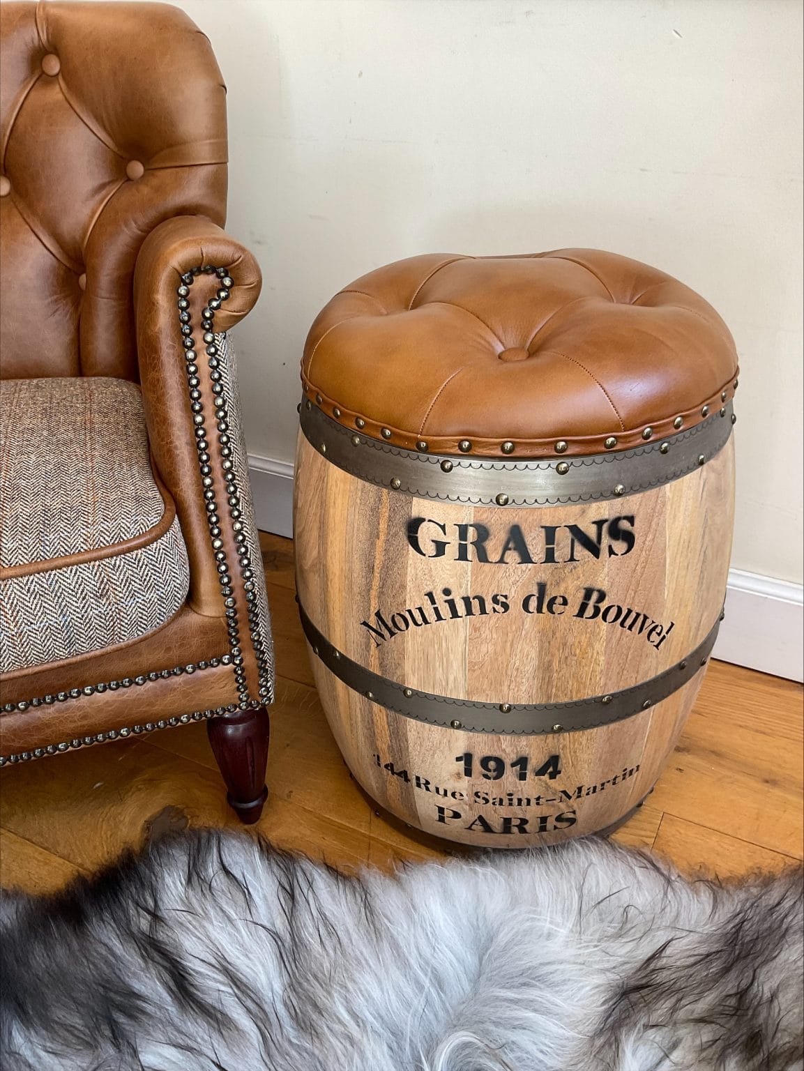 Finished to retain the character of the original barrel, this stool brings an authentic rustic accent to living rooms, seating corners and informal spaces. The combination of barrel texture and leather lid adds visual interest while remaining functional for everyday casual seating or decorative use.