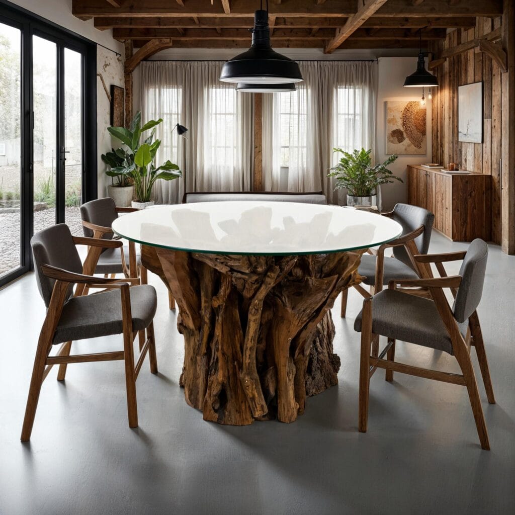 The Woodland Round Dining Table brings natural character and relaxed style to your dining space. Crafted around a sculptural solid-wood base, each table showcases distinctive grain patterns and organic form, ensuring every piece is unique. Topped with a clear, tempered glass surface, it provides a stable, generous work area for meals while keeping the timber beneath the visual focus.