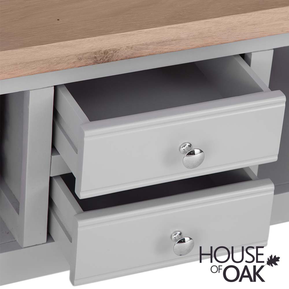 The Roma Oak Grey Painted Range with chunky contrasting gently lime-washed oak tops and chrome handles. This white painted collection blends classic and contemporary influences for a style all of its own.