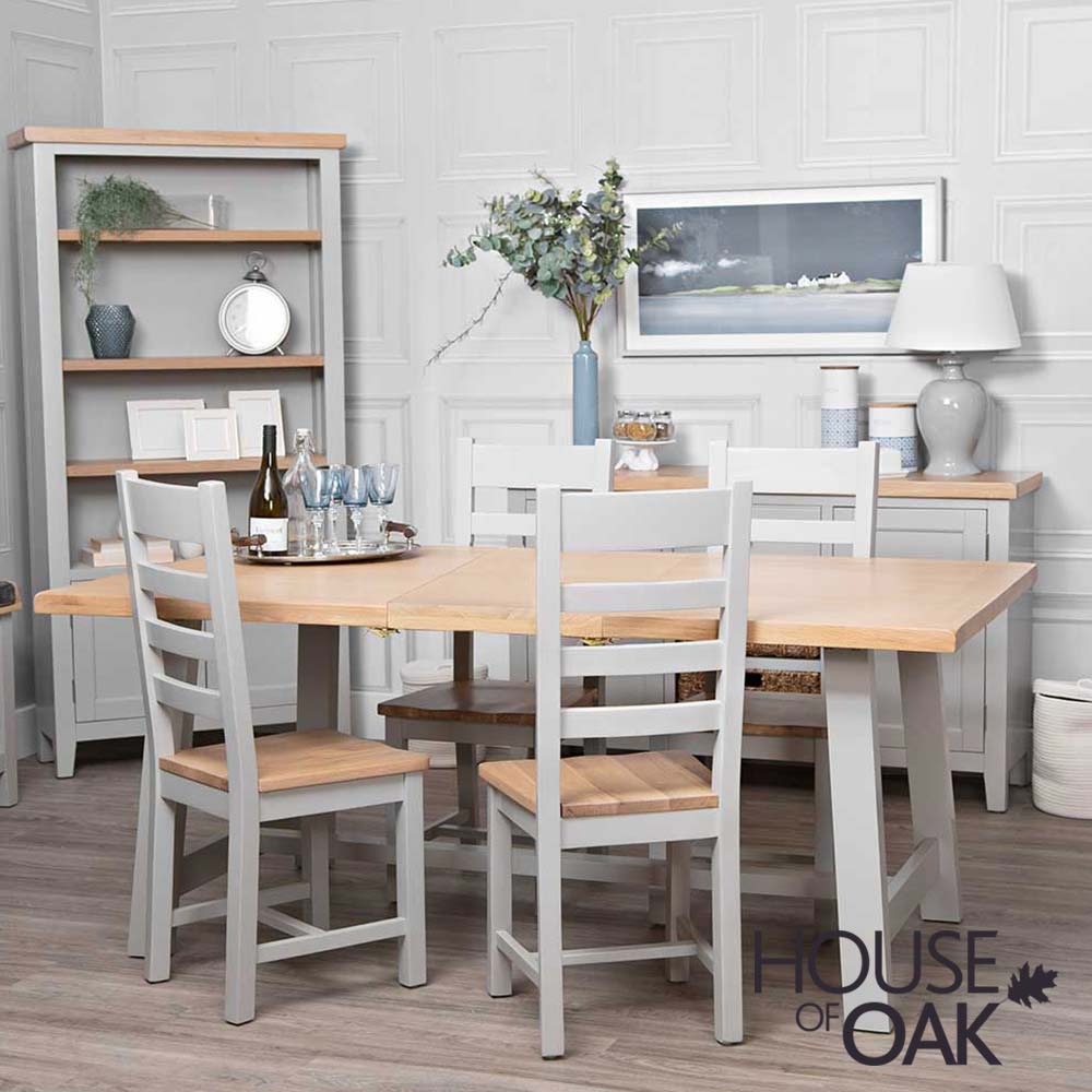 The Roma Oak Grey Painted Range with chunky contrasting gently lime-washed oak tops and chrome handles. This white painted collection blends classic and contemporary influences for a style all of its own.