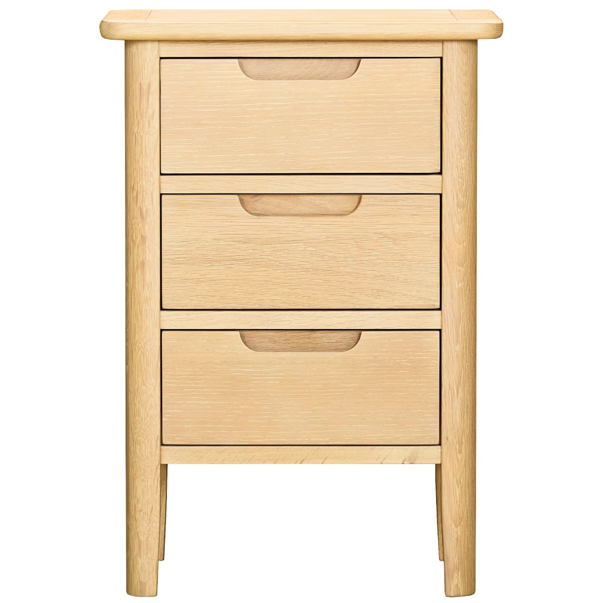 Embrace the essence of Scandinavian design with this minimalist bedside table, a perfect blend of simplicity and elegance for your bedroom. Featuring three spacious drawers, it offers ample storage for your nighttime necessities, from books and glasses to electronic devices. Constructed from light oak, its clean lines and understated aesthetic seamlessly complement any interior décor. The design is highlighted by cut-out pull handles, showcasing high-quality craftsmanship with dovetailed drawers, slender curved legs, and gently rounded tops that complete its refined appearance.