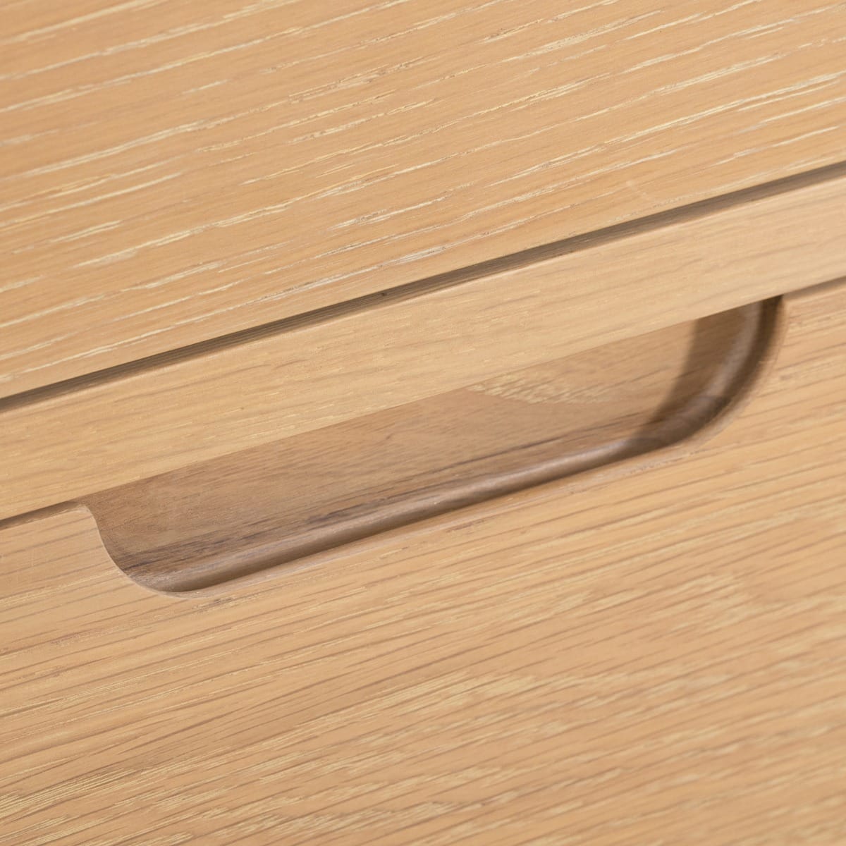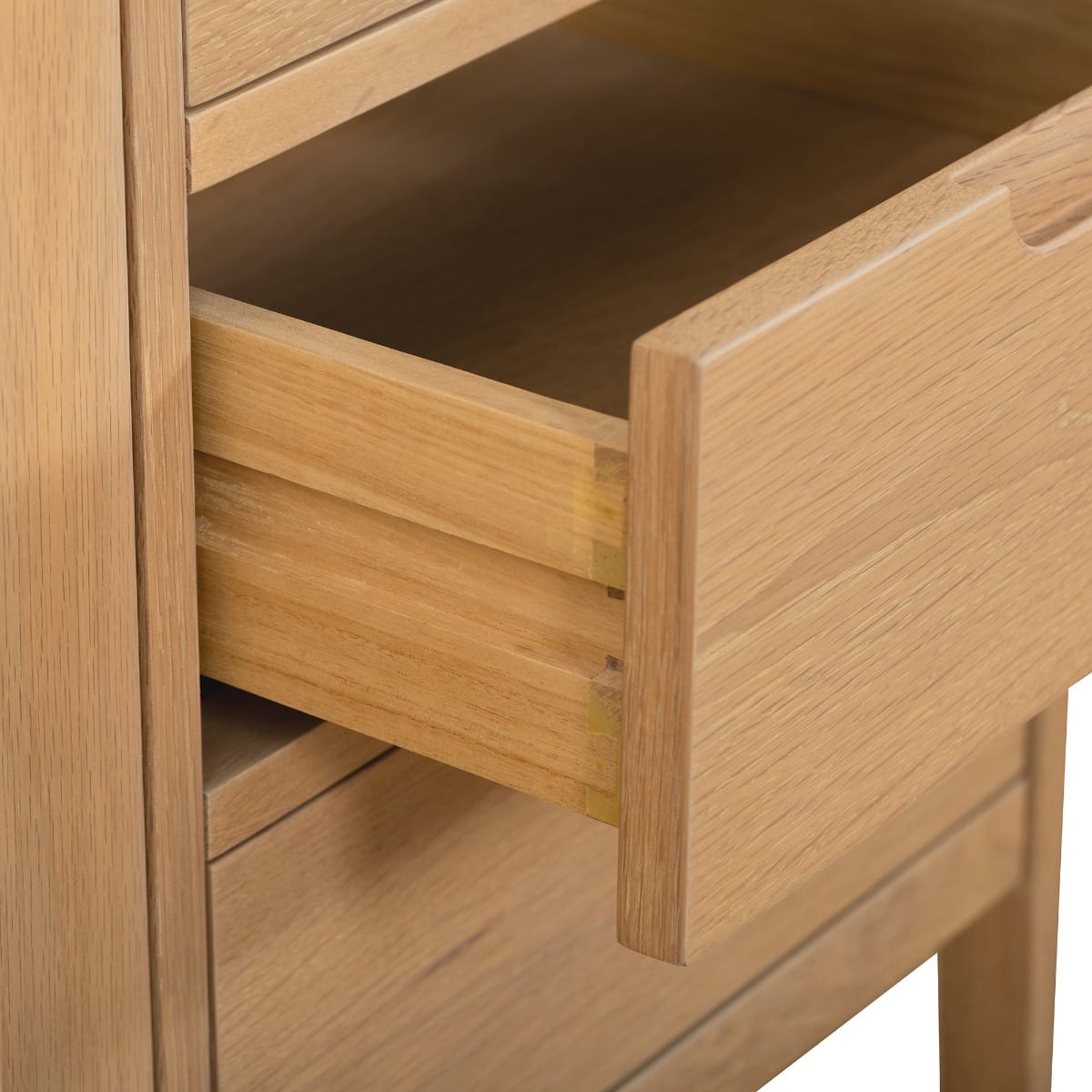 Key Features: • Crafted from pale oak • Dovetailed drawers for enhanced durability • Cut-out pull handles for a sleek look • Slim, curved legs and rounded tops for a sophisticated finish • Simple and minimalist design to suit various bedroom styles