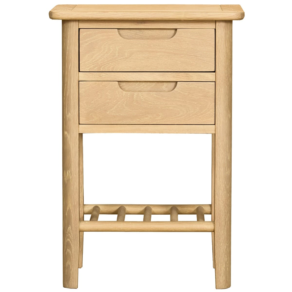 Embrace the minimalist charm of Scandinavian design with this elegant bedside table, seamlessly blending functionality and style. Crafted from pale oak, it features two spacious drawers and a stylish low shelf, providing ample storage for your nighttime essentials, from books and glasses to electronic devices. The clean lines and simple silhouette ensure it complements any bedroom décor, adding a touch of refined simplicity. High-quality craftsmanship is evident in the dovetailed drawers, cut-out pull handles, slim curved legs, and rounded tops, all contributing to its sophisticated appeal.