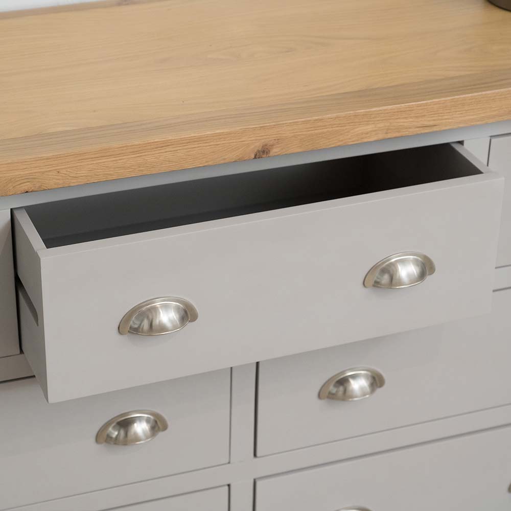 Explore the distinctive allure of our Tuscany Oak Grey Painted Range, featuring robust, smoothly curved solid oak and oak veneer tops. Adorned with sleek chrome handles and crafted with dovetail drawers, this collection seamlessly merges classic and contemporary influences, creating a distinctive style. Constructed with precision, the Tuscany Oak Grey Painted Range exudes a unique charm, offering a blend of timeless elegance and modern sophistication. The grey painted finish adds a touch of contemporary flair to the classic design elements. The collection is meticulously crafted with a Solid Pine carcass, complemented by MDF Side Panels and Door Panels, ensuring both durability and aesthetic appeal. Immerse your living space in the distinctive character of the Tuscany Oak Grey Painted Range, where classic craftsmanship meets contemporary chic.