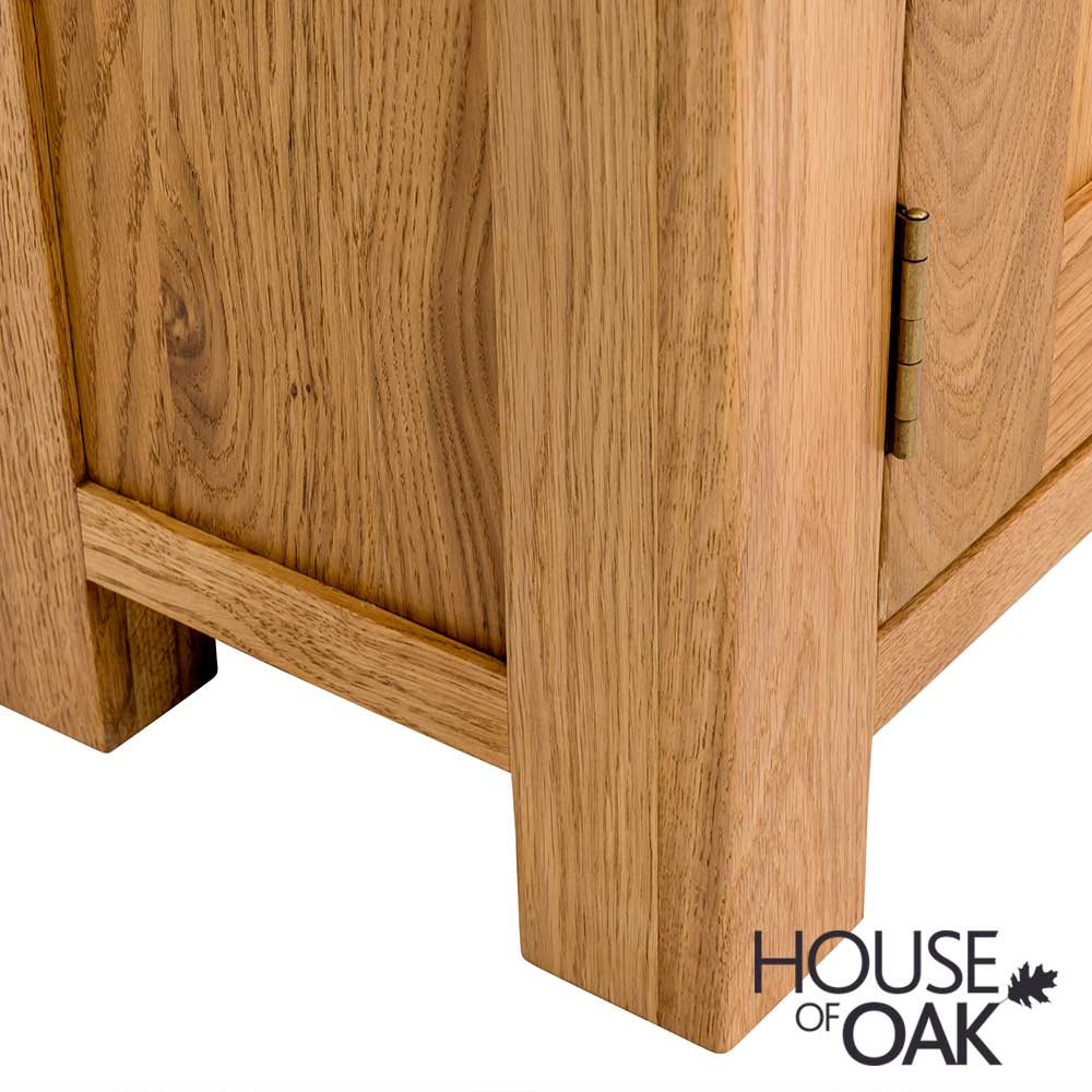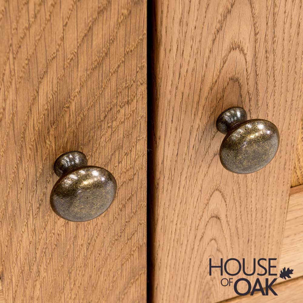 The Windsor Oak Range offers a slice of country living which is reminiscent of a traditional style. Finished by hand with a brushed oil, the effect is one of warmth and individual character as the natural grain of the oak is gently emphasised. The antique style, brass effect, drop handles add to the traditional feel of the furniture and complement the warmth of the oak. Corners are delicately rounded in keeping with the softness of the country style. There are bedroom, dining, and living pieces available in the Windsor Oak Range. Predominantly made from Solid Oak with an Engineered Panel for the Middle Insert in the Tops of the Cabinets, Dining Tables and Wardrobes. This consists of 3mm oak veneer, plywood middle section with a 3mm oak veneer underneath.