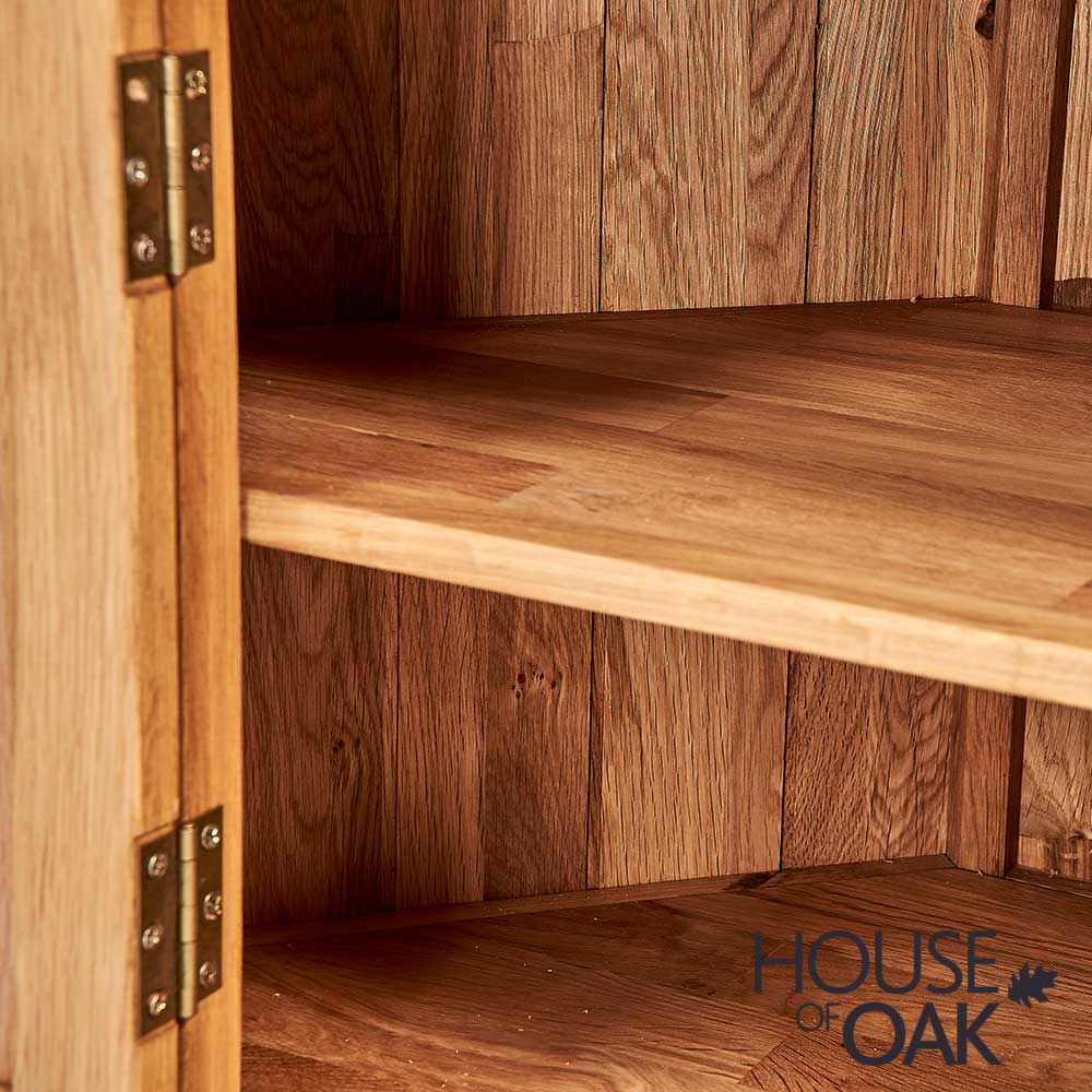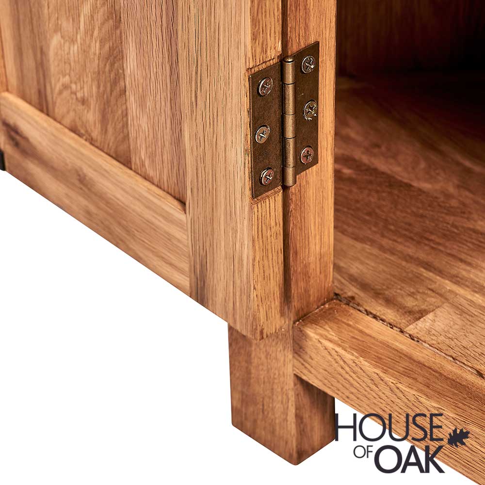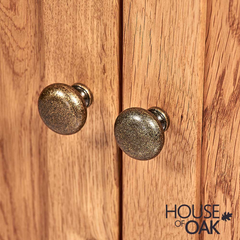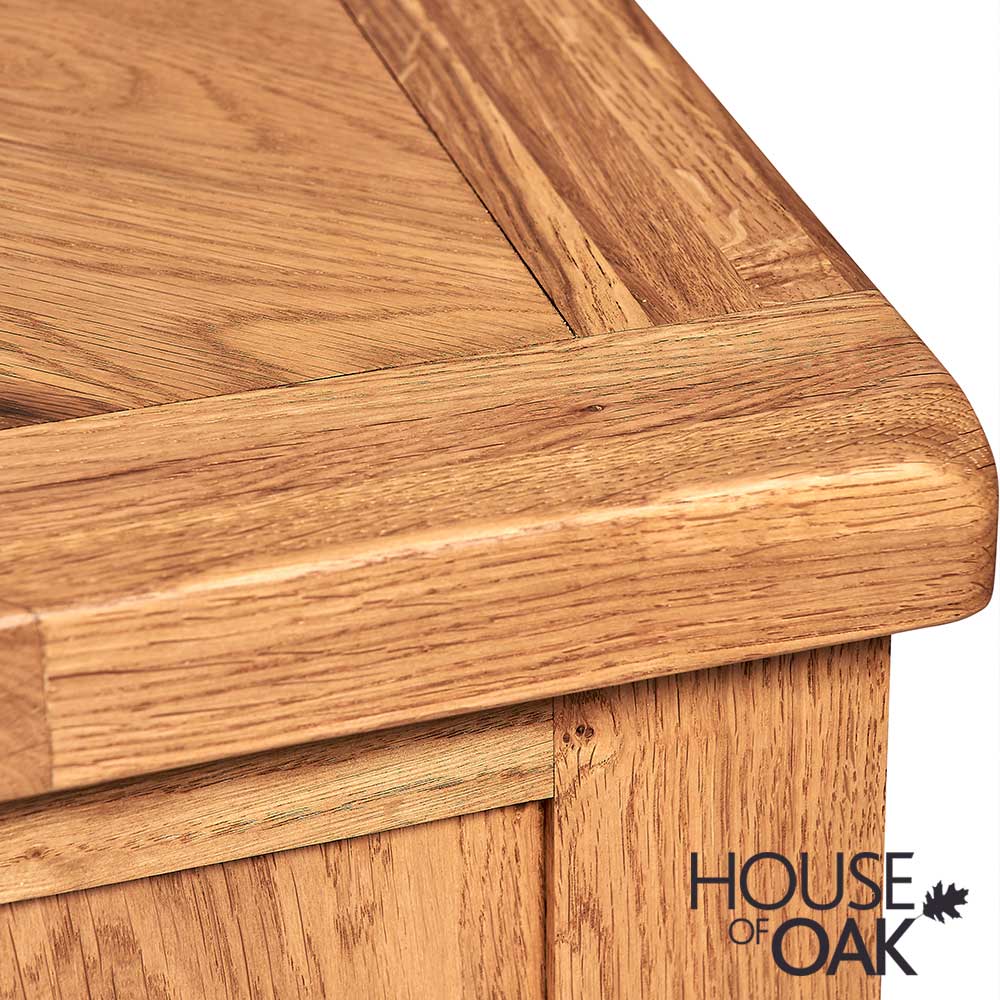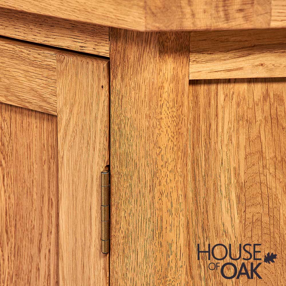 The Windsor Oak Range offers a slice of country living which is reminiscent of a traditional style. Finished by hand with a brushed oil, the effect is one of warmth and individual character as the natural grain of the oak is gently emphasised. The antique style, brass effect, drop handles add to the traditional feel of the furniture and complement the warmth of the oak. Corners are delicately rounded in keeping with the softness of the country style. There are bedroom, dining, and living pieces available in the Windsor Oak Range. Predominantly made from Solid Oak with an Engineered Panel for the Middle Insert in the Tops of the Cabinets, Dining Tables and Wardrobes. This consists of 3mm oak veneer, plywood middle section with a 3mm oak veneer underneath.